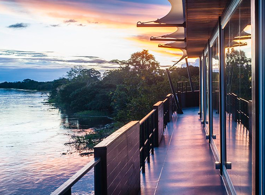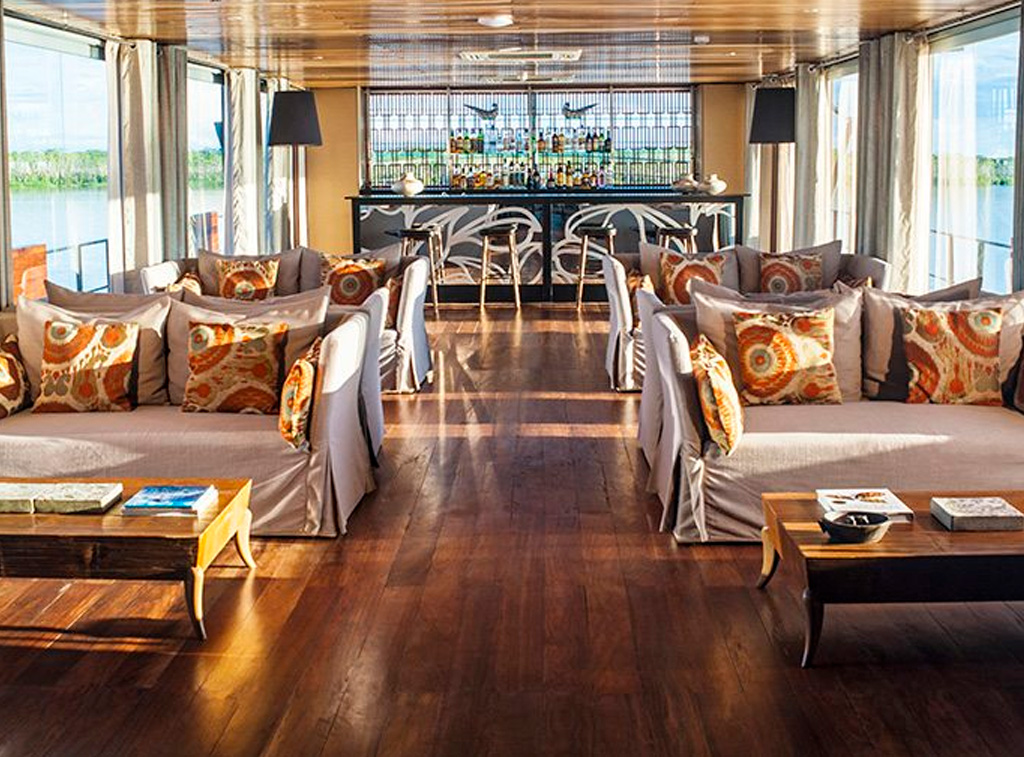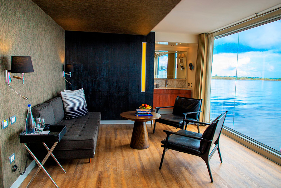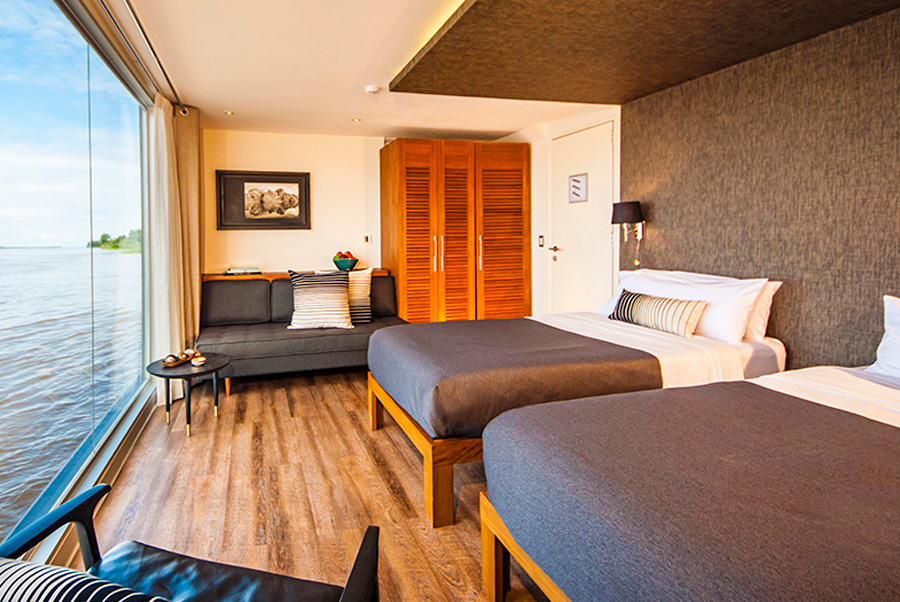 A bordo, 16 amplias suites con ventanas de piso a techo ofrecen a los huéspedes una vista completa del majestuoso río y las selvas tropicales del Amazonas.