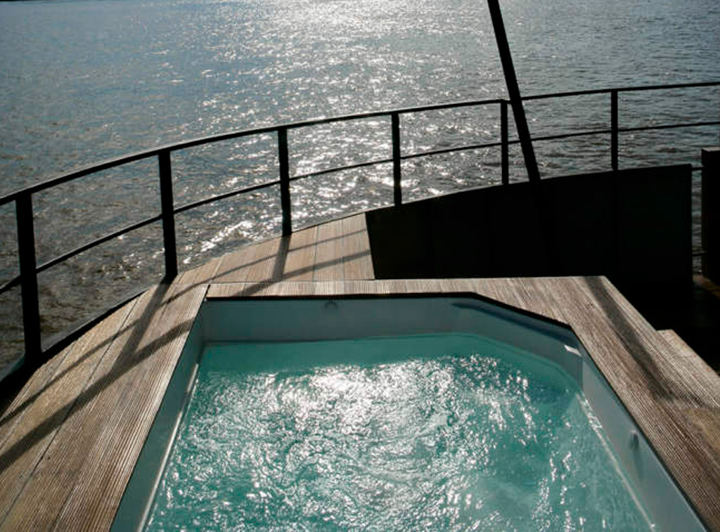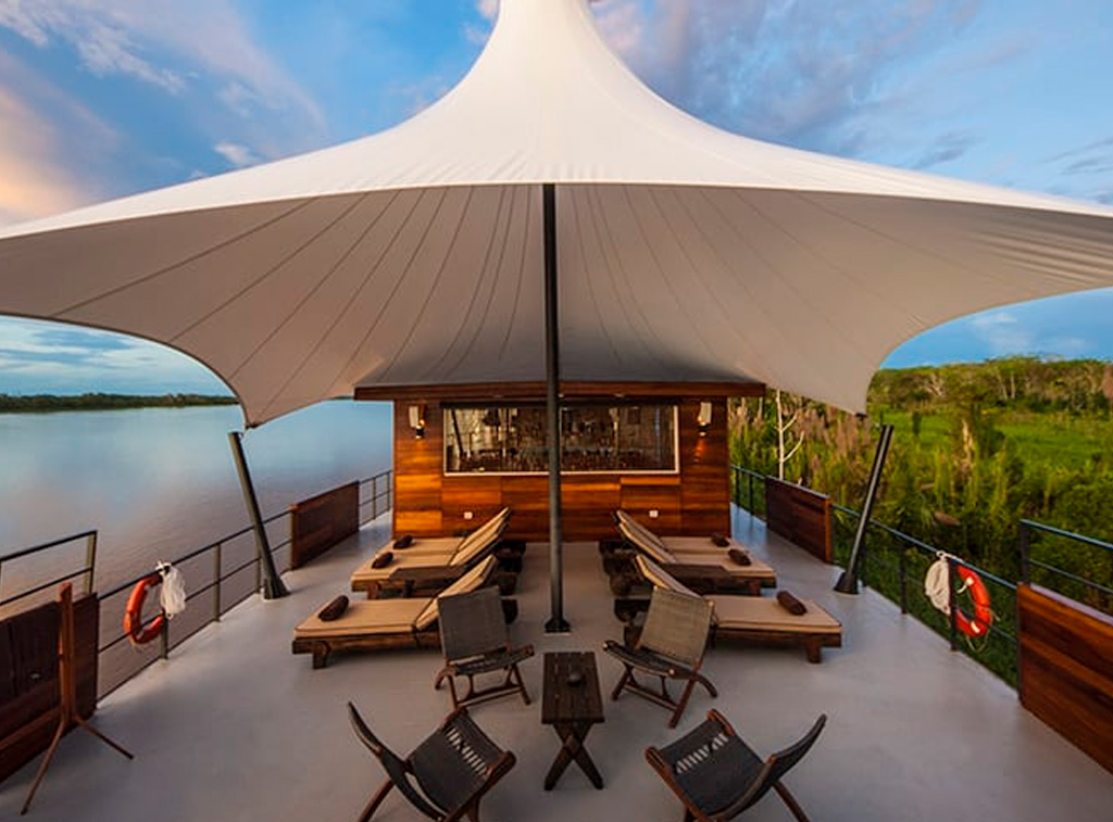 La cubierta superior cuenta con amplias comodidades, que incluyen un jacuzzi, un salón, un bar y una plataforma de observación al aire libre. En gastronomía, los comensales disfrutan de lo mejor de la cocina peruana con un menú integral creado por Pedro Miguel Schiaffino, uno de los chefs más talentosos del Perú, conocido por utilizar productos e ingredientes de la Amazonía peruana.
