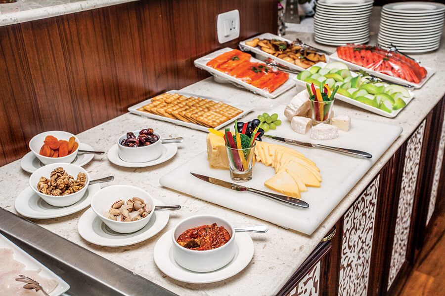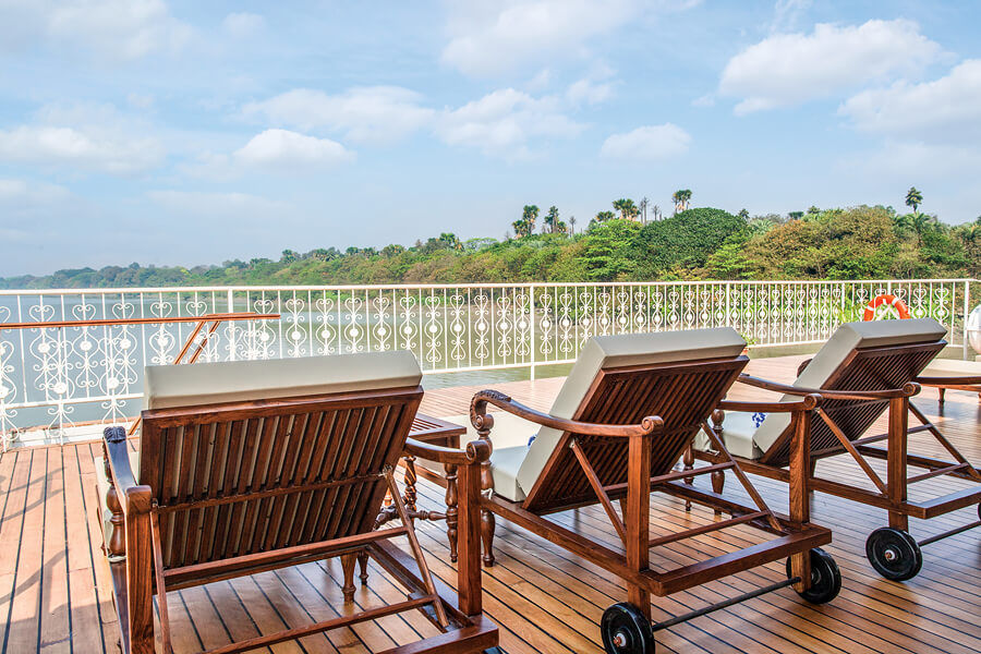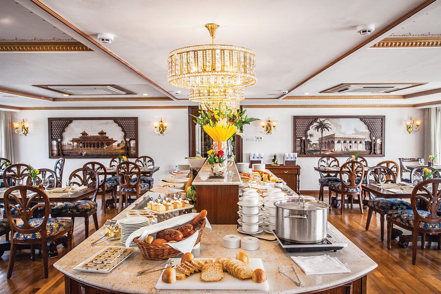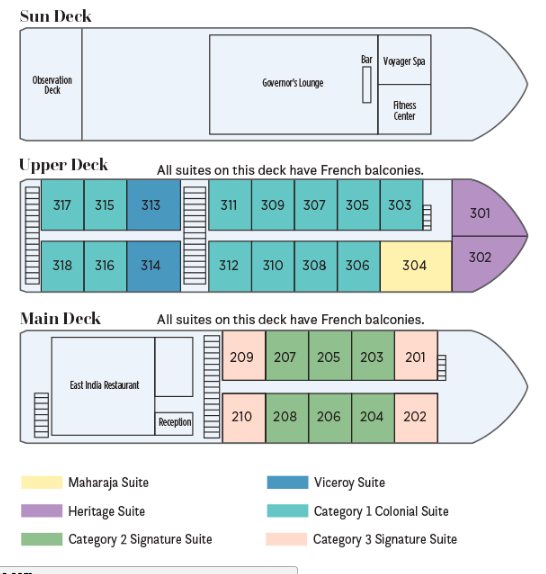 Las espaciosas suites de techos altos del barco son un santuario sereno, con hermosos murales pintados a mano y todas las comodidades de un hotel de cinco estrellas. Todas las suites tienen una acogedora zona de estar y un balcón francés con puertas de cristal del suelo al techo. Una cama vestida con suaves sábanas, con varias opciones de almohadas. Su amplio baño tiene una ducha de efecto lluvia, cómodos albornoces y zapatillas y productos de baño de calidad spa. Otras comodidades de alta gama incluyen una generosa cantidad de espacio de guardarropas, almacenamiento debajo de la cama, un televisor de pantalla plana con una amplia selección de películas a pedido, control de temperatura individual, agua embotellada que se repone a diario, fruta fresca y flores a la llegada, y Base para iPhone con despertador, espejos de maquillaje y enchufes universales.