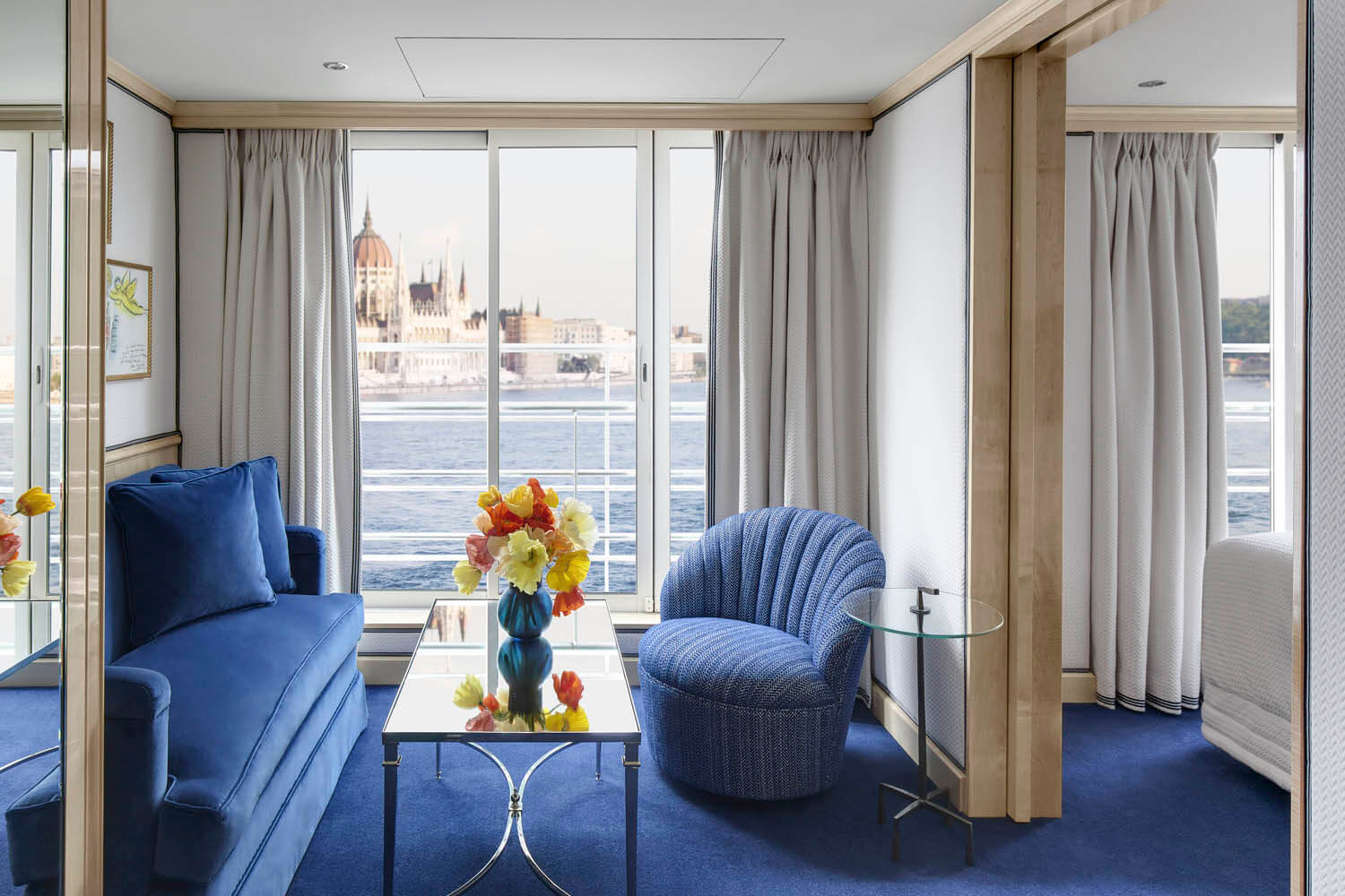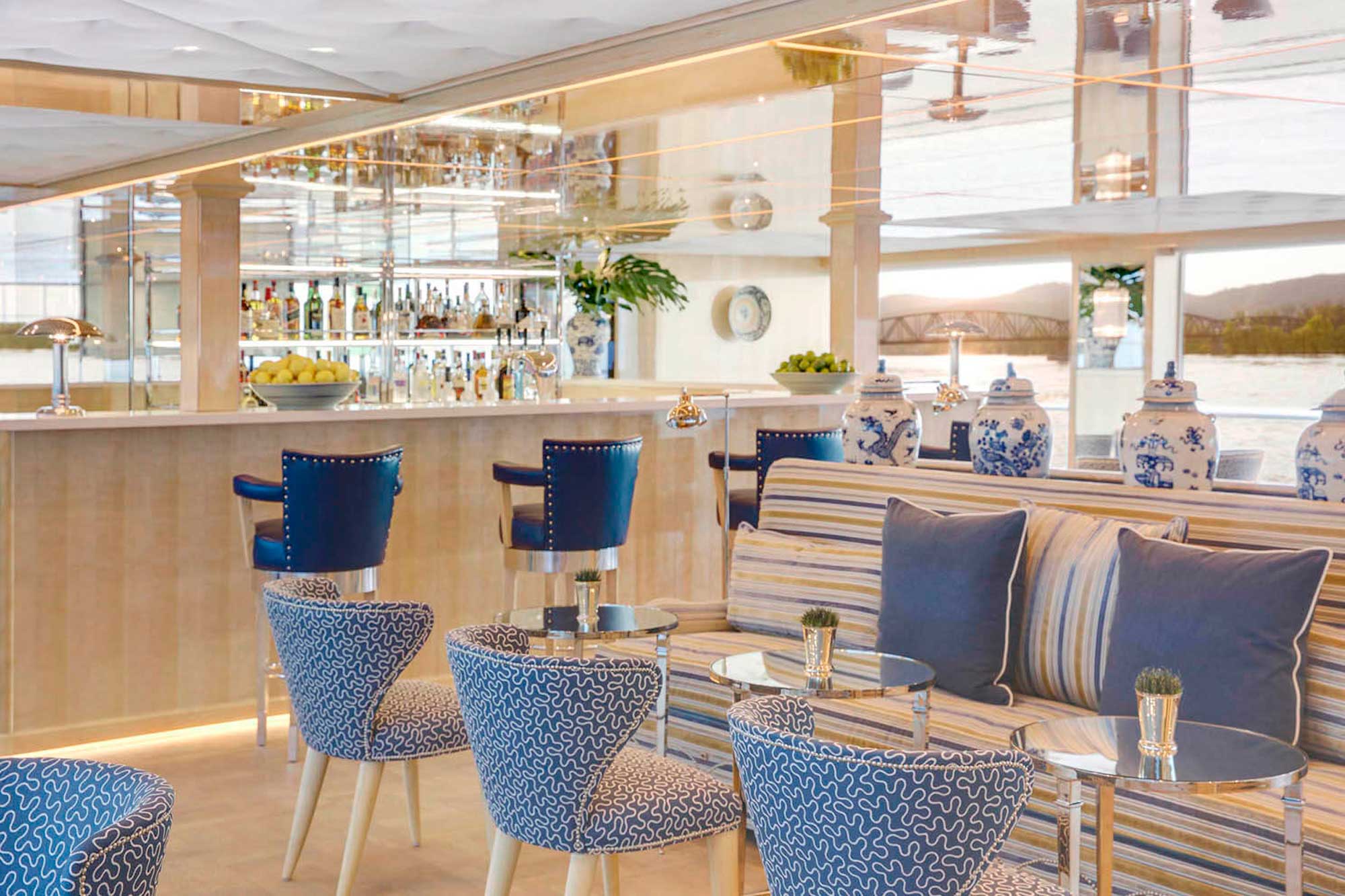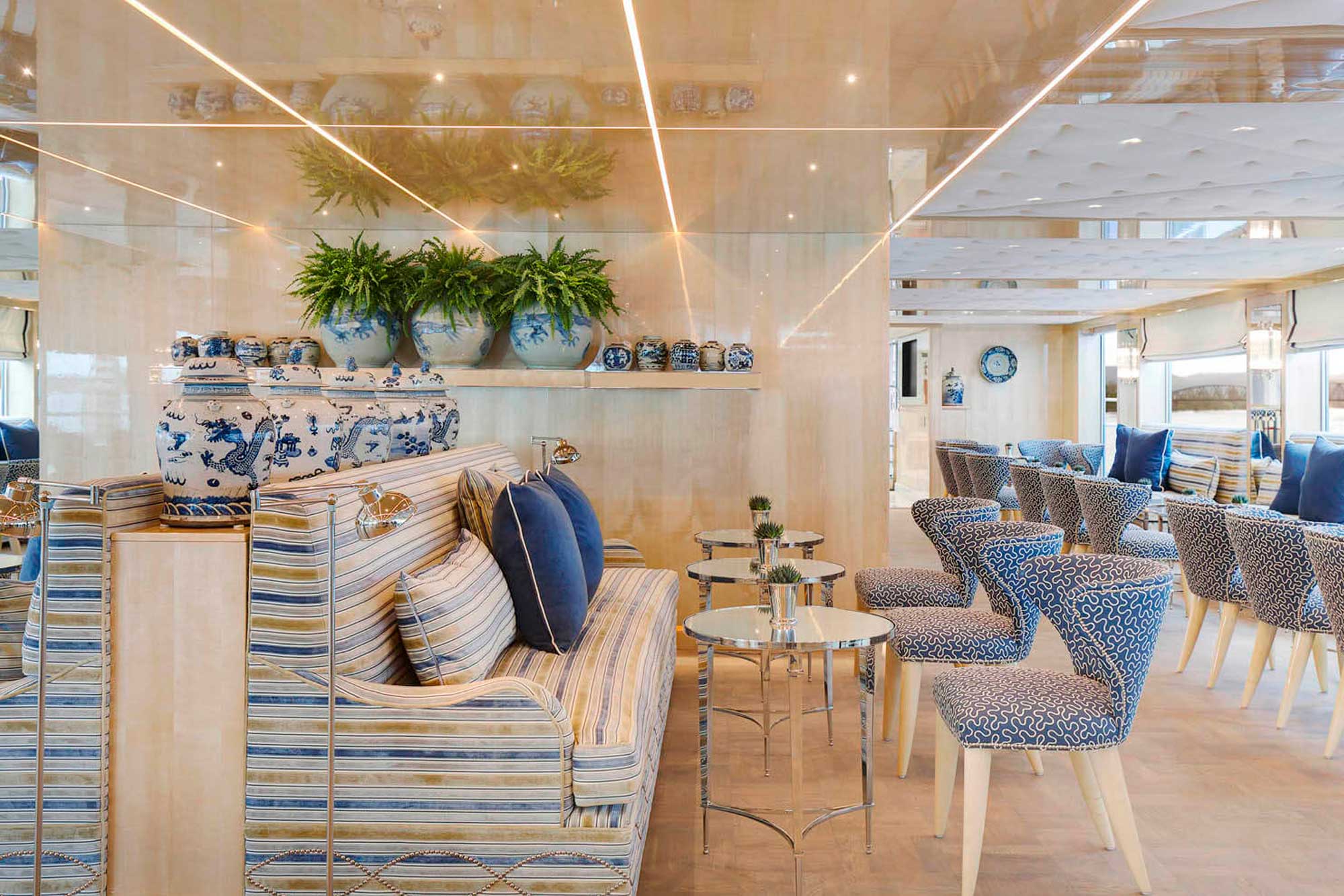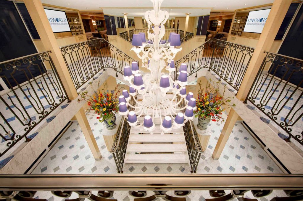 SS Beatrice cuenta con su estilo de yate con madera clara y acabados en azul y blanco, un lobby renovado con elegantes espejos, pisos de mármol, candelabro de Murano blanco con tonos de azul y una gran escalera hecha de níquel y hierro negro. un elemento de diseño único Super barcos de Uniworld. El salón rediseñado del barco cuenta con sofás y sillas con tapicería hecha a mano, pisos de parquet y paneles de techo tapizados, persianas solares y puertos USB, lo que permite a los huéspedes cargar sus teléfonos celulares dondequiera que estén. La obra de arte en todo el barco incluye piezas de Pablo Picasso, Alexander Calder y Pino Signoretto.