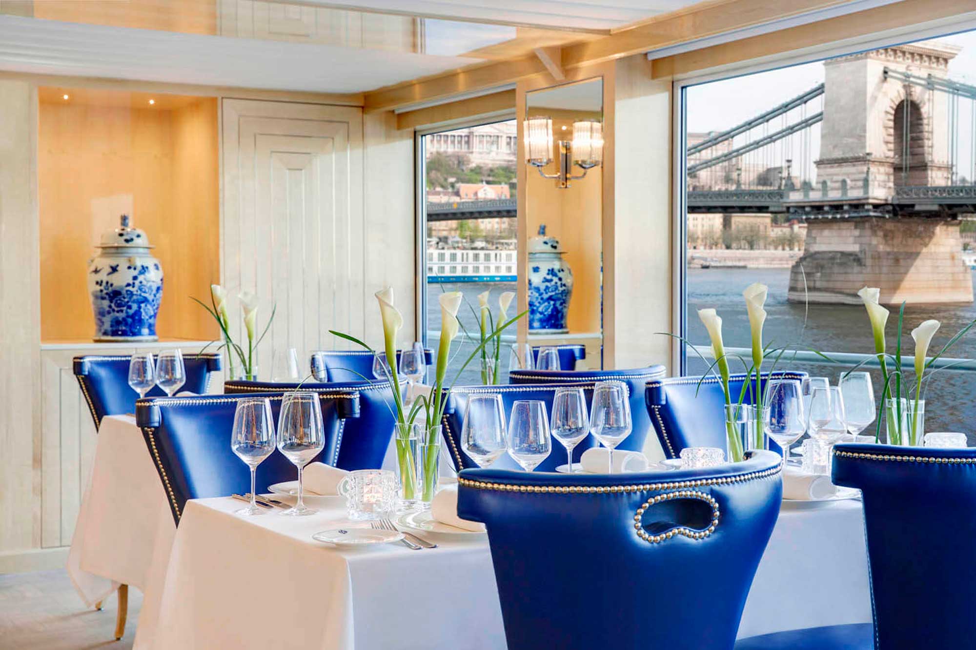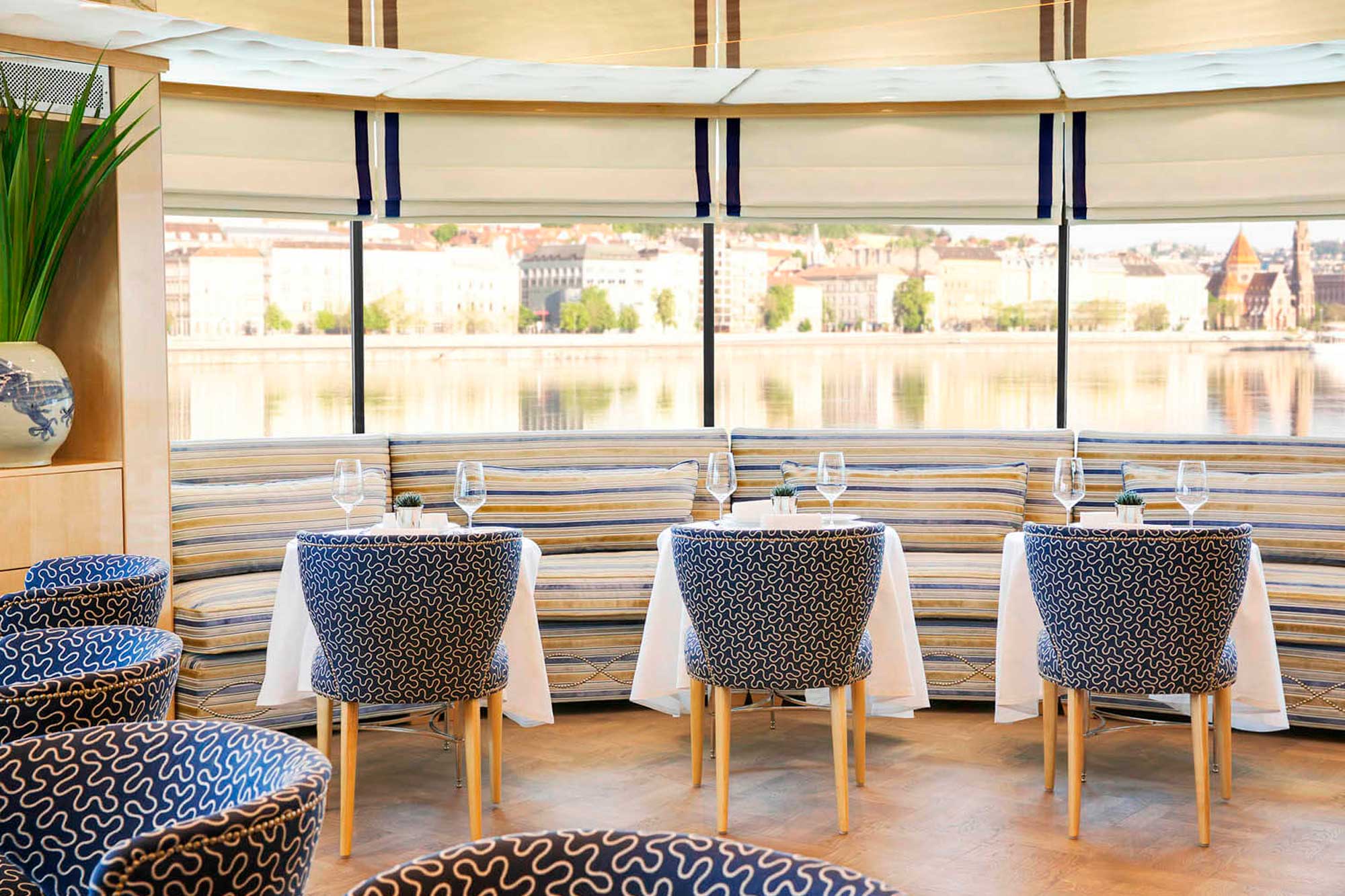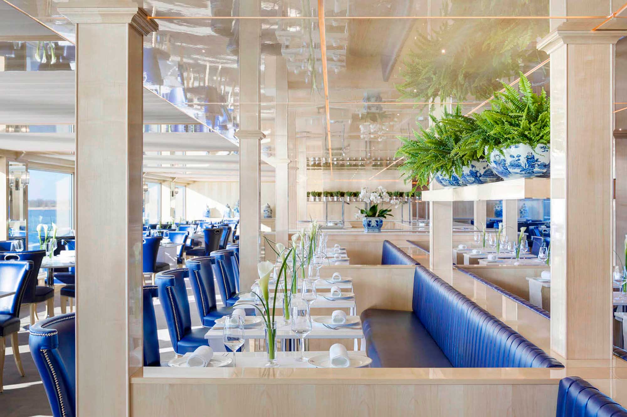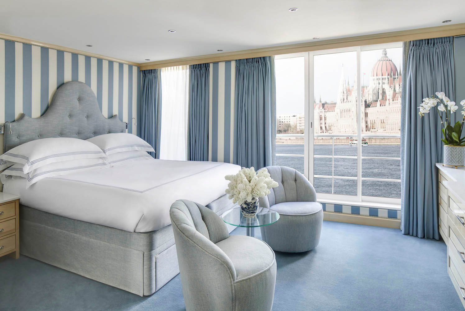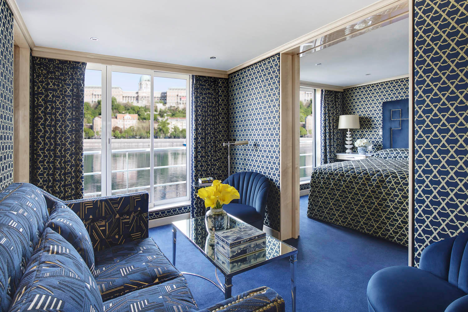 SS Beatrice cuenta con su estilo de yate con madera clara y acabados en azul y blanco, un lobby renovado con elegantes espejos, pisos de mármol, candelabro de Murano blanco con tonos de azul y una gran escalera hecha de níquel y hierro negro. un elemento de diseño único Super barcos de Uniworld. El salón rediseñado del barco cuenta con sofás y sillas con tapicería hecha a mano, pisos de parquet y paneles de techo tapizados, persianas solares y puertos USB, lo que permite a los huéspedes cargar sus teléfonos celulares dondequiera que estén. La obra de arte en todo el barco incluye piezas de Pablo Picasso, Alexander Calder y Pino Signoretto.