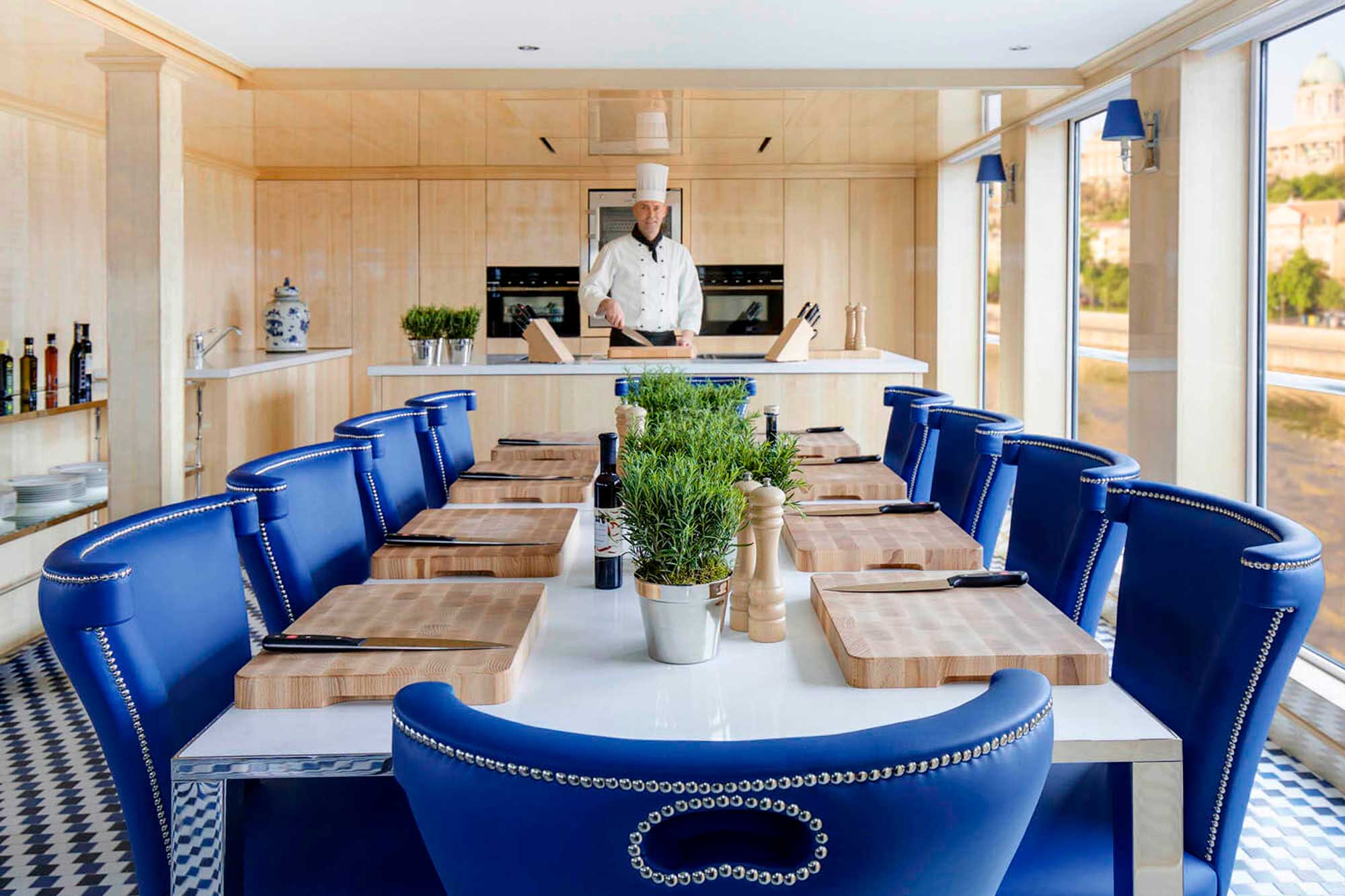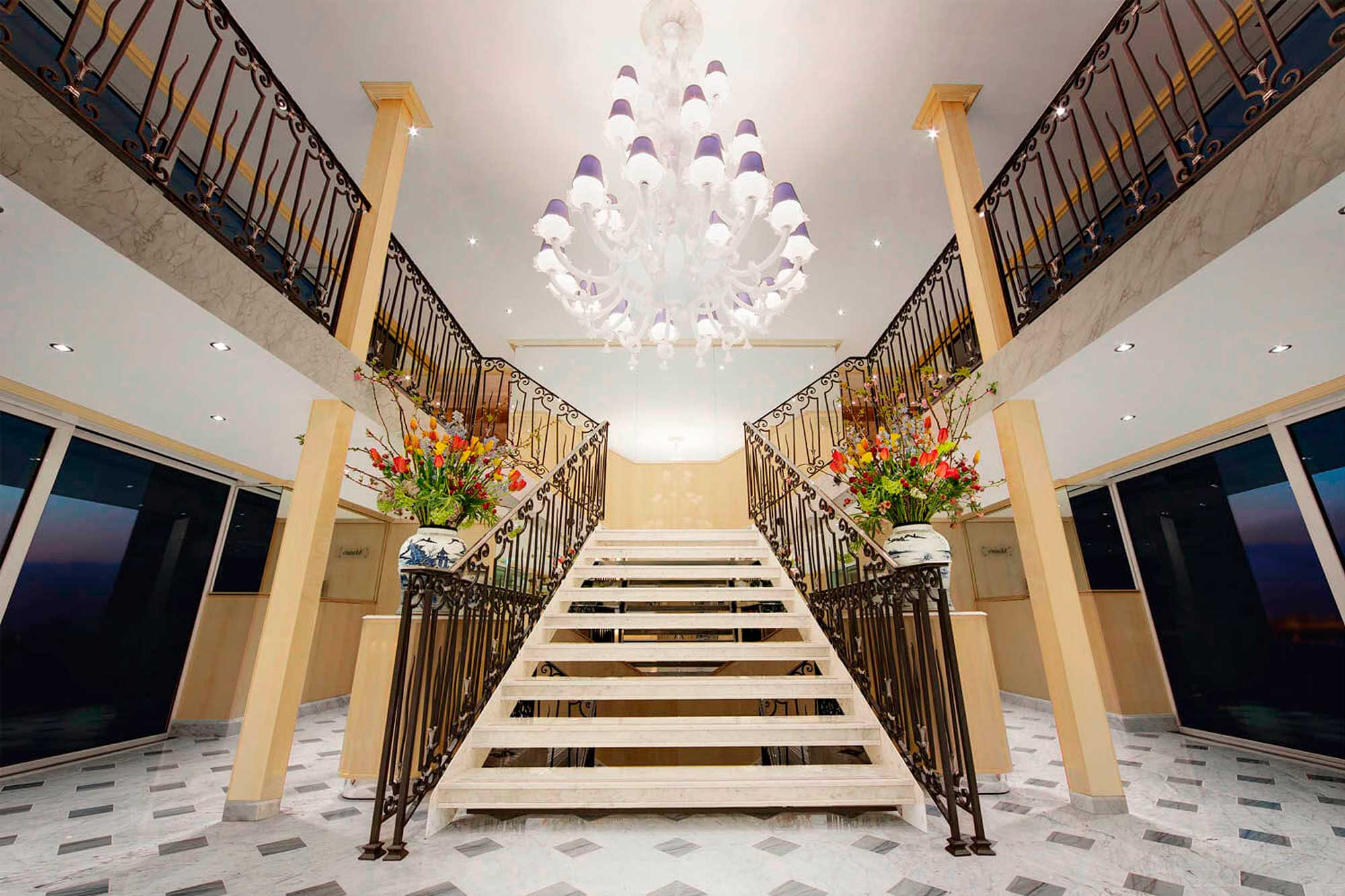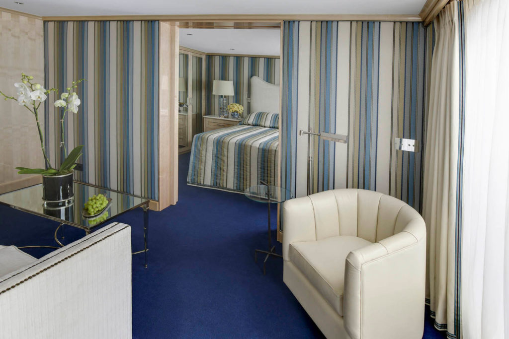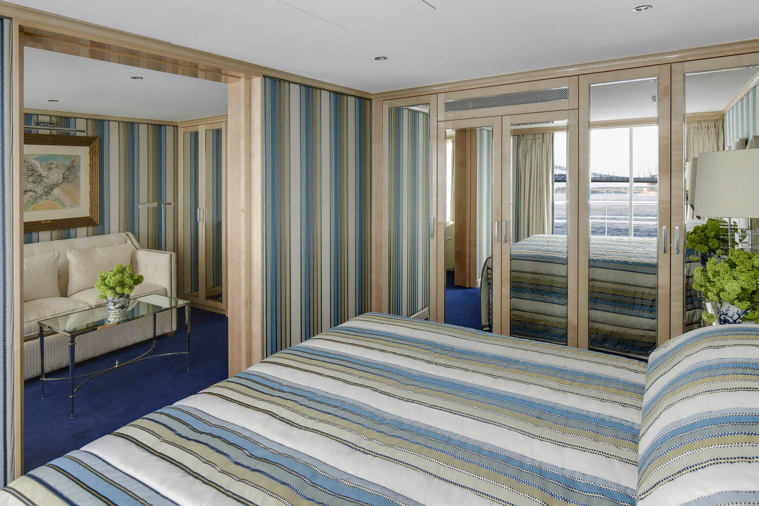 SS Beatrice cuenta con su estilo de yate con madera clara y acabados en azul y blanco, un lobby renovado con elegantes espejos, pisos de mármol, candelabro de Murano blanco con tonos de azul y una gran escalera hecha de níquel y hierro negro. un elemento de diseño único Super barcos de Uniworld. El salón rediseñado del barco cuenta con sofás y sillas con tapicería hecha a mano, pisos de parquet y paneles de techo tapizados, persianas solares y puertos USB, lo que permite a los huéspedes cargar sus teléfonos celulares dondequiera que estén. La obra de arte en todo el barco incluye piezas de Pablo Picasso, Alexander Calder y Pino Signoretto.